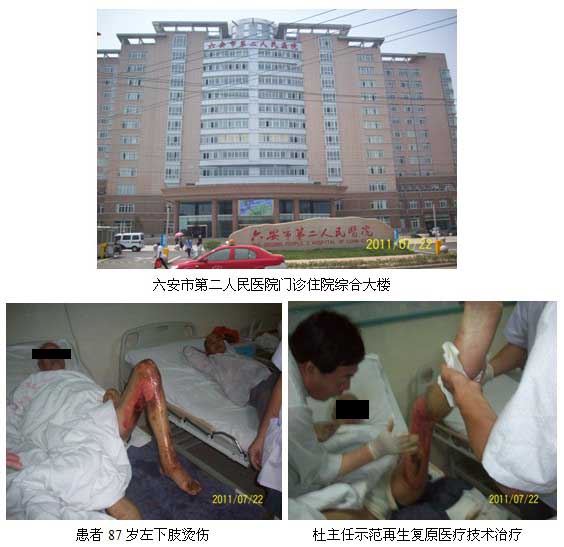 7月22日,杜主任走訪了六安市第二人民醫(yī)院外科、第一人民醫(yī)院燒傷整形科,與二院涂蒼慨主任深入交流再生復(fù)原醫(yī)療技術(shù)的發(fā)展和臨床實踐情況,下午為一名87歲老年燒傷患者示范再生復(fù)原醫(yī)療技術(shù)換藥。同時還走訪了一院燒傷整形科和趙遵江主任交流了再生復(fù)原醫(yī)療技術(shù)最近的研究成果和國內(nèi)外臨床實踐可喜的成果,達(dá)到了深入推廣再生復(fù)原醫(yī)療技術(shù)的目的。