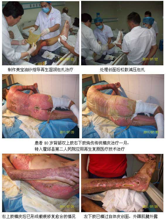 7月19日~20日,杜福勤主任應(yīng)霍邱第二人民醫(yī)院外科朱主任和徐凡主任的邀請,去該院會診一名80歲燒傷患者,該患者曾在省城某三甲醫(yī)院植皮治療后轉(zhuǎn)入霍邱二院應(yīng)用再生醫(yī)療技術(shù)治療,杜主任建議在應(yīng)用再生醫(yī)療技術(shù)治療燒傷創(chuàng)面的同時,加強(qiáng)對患者的營養(yǎng)支持,培養(yǎng)皮膚組織再生皮島,使之缺損皮膚組織最大化的再生愈合。7月21日,杜主任和二院婦產(chǎn)科的醫(yī)師們一同交流了醫(yī)用復(fù)合敷料美寶創(chuàng)瘍貼的療效及效果,介紹其功能、臨床效果、注意事項等。