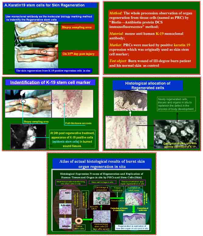 美國從脂肪組織中獲取干細胞的技術(shù)利用的就是我們的思路。凡是利用這種思路研究的結(jié)果,就都屬于我們中國人的發(fā)明,因為我們擁有這項技術(shù)的專利權(quán),他們的研究是在看了我們的研究思路后才完成的。這就又形成一個定律:既然皮膚組織中能找出干細胞,那其他組織器官中也都能找出干細胞。而從器官組織中找到的干細胞的前身細胞是誰?這是這項科學(xué)體系的關(guān)鍵。在燒傷創(chuàng)面的研究中,我們確認干細胞來源于原位的組織細胞,我們早已將其命名為“潛能再生細胞”,這是人體各器官、組織先天存在的再生潛能,所以形成了皮膚具有再生潛能,人體各器官、組織都具有再生潛能的再生定律。