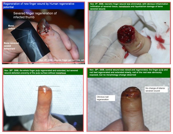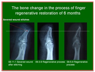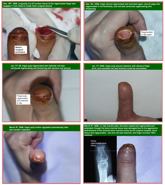 這是一個因外傷而斷指的患者6d~7d的創(chuàng)面。該指體離斷以后在醫(yī)院進行了再植連接手術(shù),但沒有成活。而后來我們這里實施了原位再生復(fù)原斷指治療技術(shù),因為是感染的創(chuàng)面,在22天時,創(chuàng)面就提前封閉了,但指體沒有完全再生復(fù)原,缺少了一段。怎么辦?由于我們按照生命定律確認所有器官里都有再生生命,重新再生的手指指體里仍然繼承了人體再生潛能的結(jié)構(gòu),我們相信這個斷指還能再生,所以我們重新截掉部分新再生的指體,形成新鮮的創(chuàng)面,再重新原位培養(yǎng)指體斷面,最后指體原位再生復(fù)原了。人體是由上皮組織、結(jié)締組織、肌肉組織、神經(jīng)組織這四大組織組成,現(xiàn)在含有這四大組織的斷指再生修復(fù)了,堅信人體組織完全可實現(xiàn)原位再生復(fù)原。以上病例驗證了人體又表達出了新的再生生命定律。