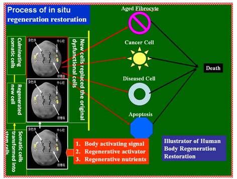 人在30歲以前,各器官、組織中的細胞維持在平衡狀態(tài),器官功能強壯,細胞功能旺盛,人體“基本生命”強盛。過了30歲,則人體器官和組織中的細胞開始出現(xiàn)相對平衡,細胞開始衰老,出現(xiàn)了正常生長的細胞、少量衰老的細胞與死亡細胞之間的相對平衡維持,器官功能正常,細胞功能相對旺盛,人體“基本生命”相對旺盛。人超過了40歲,衰老的細胞開始增多,衰老狀態(tài)細胞與生長狀態(tài)細胞幾乎處于相同的比例狀態(tài),此時尚且還能夠維持這種生長與衰老細胞及死亡細胞在數(shù)量上的平衡狀態(tài),但器官功能已經(jīng)開始下降,細胞功能也開始出現(xiàn)減退,人體“基本生命”開始出現(xiàn)衰弱表現(xiàn)。當(dāng)人超過了50歲,正常生長細胞越來越少,衰老細胞越來越多,人體衰老細胞的數(shù)目已經(jīng)超過了正常生長的細胞數(shù)目,此時衰老的細胞占了多數(shù),平衡狀態(tài)就被打破,并隨著年齡增長,人體細胞開始出現(xiàn)纖維化、疾病、異變及凋亡等現(xiàn)象,器官開始出現(xiàn)退行性改變,器官功能進一步下降,細胞功能進一步低下,人體“基本生命”也更加衰弱,當(dāng)這些細胞達到一定數(shù)量時,會導(dǎo)致器官功能喪失,進而人體死亡狀態(tài),人體“基本生命”終止。但如果啟動人體潛能生命體的功能,人體一旦進入再生復(fù)原后,上述“基本生命”的規(guī)律將發(fā)生改變,再生復(fù)原可以使人體“基本生命”得到保障和加強,人體“基本生命”可以重新保持旺盛的生命活力。