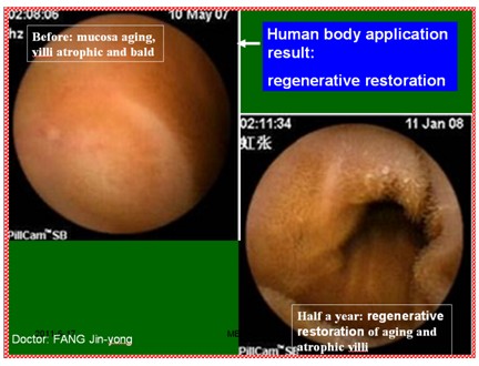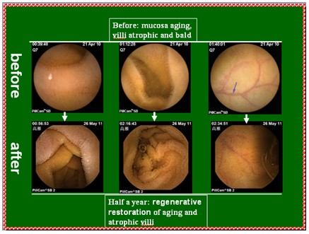 某會員,42歲,胃腸道衰老非常嚴(yán)重。養(yǎng)生前膠囊胃鏡表現(xiàn):小腸粘膜和粘膜下層明顯萎縮,變薄,粘膜下血管網(wǎng)及血管袢清晰可見,絨毛稀疏、增寬而短、斷裂、退化、部分區(qū)域絨毛脫落甚至脫失,隱窩深度變淺。整個胃腸黏膜系統(tǒng)呈現(xiàn)衰老狀態(tài)。養(yǎng)生一年后膠囊胃鏡表現(xiàn):小腸粘膜和粘膜下層明顯增厚,看不到粘膜下血管網(wǎng)及血管袢,絨毛濃密、長度增加,直徑增粗,沒有明顯斷裂、脫落、脫失的絨毛粘膜,隱窩變深。整個胃腸黏膜系統(tǒng)完全呈現(xiàn)為年輕健康的狀態(tài)。這個結(jié)果是當(dāng)前生命科學(xué)前沿所不能達到的。器官移植雖然可以,但移植本身是有缺陷的。