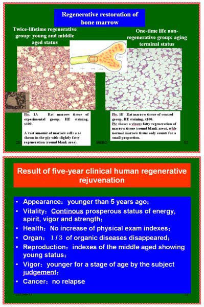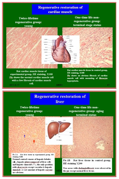 試驗證明,大白鼠實現(xiàn)了2倍年齡不衰老,人體就能實現(xiàn)2倍年齡不衰老。我們對每個器官都進行驗證。試驗結(jié)果:用300天雄性大白鼠,相當(dāng)于人類60歲,一組加再生物質(zhì)喂養(yǎng),一組不加再生物質(zhì)喂養(yǎng)。沒有加再生物質(zhì)喂養(yǎng)的老鼠,在一倍壽命(平均480天)時就衰老死亡了,器官組織學(xué)檢查確認各器官都衰老于中年。而加入再生物質(zhì)喂養(yǎng)的老鼠活到兩倍壽命時還都活著,通過器官組織學(xué)檢查,各個器官都處于年輕狀態(tài)。目前,冠心病、腎臟,肺纖維化等疾病通過再生復(fù)原醫(yī)療技術(shù),按照人體再生生命定律,器官衰老難題都已經(jīng)解決了。
