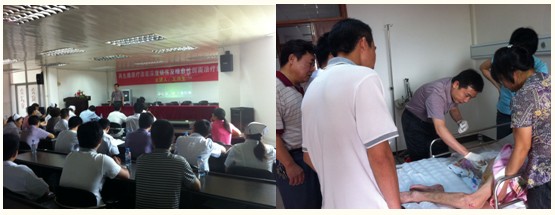 2012年6月4日下午,應(yīng)廣東省東源縣中醫(yī)院葉勇主任之邀,中國中西醫(yī)結(jié)合學(xué)會(huì)燒傷專業(yè)委員會(huì)常委兼秘書、《中國燒傷創(chuàng)瘍雜志》副總編輯、北京美寶燒傷創(chuàng)瘍研究所副所長、第二臨床研究部主任王洪生研究員到醫(yī)院做“再生復(fù)原療法在深度燒傷及難愈性創(chuàng)面治療新進(jìn)展”專題學(xué)術(shù)講座。廣東省東源縣中醫(yī)院全院的醫(yī)護(hù)人員均參加了此次培訓(xùn),張干華副院長主持了會(huì)議,在學(xué)術(shù)講座中,王主任首先向與會(huì)的專家介紹了著名生命科學(xué)家、醫(yī)學(xué)家、人體再生復(fù)原科學(xué)的創(chuàng)立者、再生復(fù)原療法的發(fā)明人徐榮祥教授近年來在再生醫(yī)學(xué)領(lǐng)域所取得的重大實(shí)驗(yàn)及臨床研究成果,而后王主任結(jié)合了大量的臨床病例圖片及錄像資料,主要針對(duì)深度燒傷及各類難愈性創(chuàng)傷、潰瘍創(chuàng)面的規(guī)范化處理方法與技巧、注意事項(xiàng)等進(jìn)行了細(xì)致地講解,在座的各位醫(yī)護(hù)均被這神奇的療法折服。會(huì)后,醫(yī)護(hù)人員向王主任詢問了臨床上所遇到的問題,王主任一一作了詳細(xì)解答。該院張干華副院長作總結(jié)發(fā)言時(shí),高度贊揚(yáng)了再生復(fù)原療法,稱之為一種“為患者帶來福音”的療法。隨后,應(yīng)外科葉勇主任的邀請(qǐng),王主任親自對(duì)一名褥瘡病人患者進(jìn)行了會(huì)診,并提出治療建議。