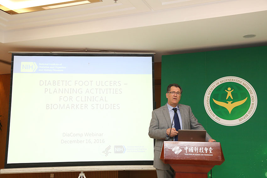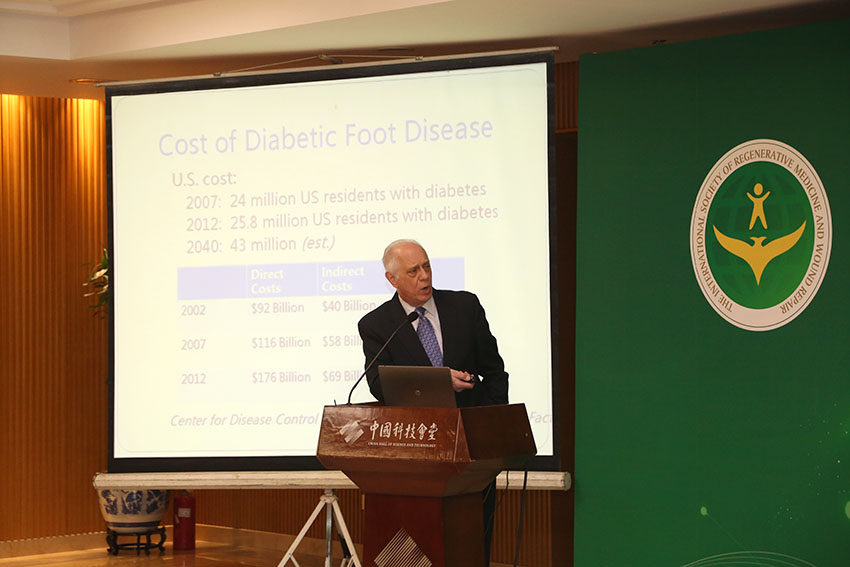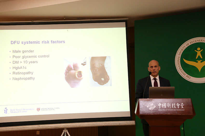 來自各醫(yī)學(xué)專家教授圍繞再生醫(yī)學(xué)與創(chuàng)面修復(fù)分別發(fā)表了重要學(xué)術(shù)演講。哈佛醫(yī)學(xué)院外科副教授、BIDMC足病科主任約翰·吉里尼博士在大會上向現(xiàn)場來賓陳述了糖尿病潰瘍發(fā)病過程及如何治療,重點(diǎn)剖析了足部潰瘍的原因并從病理學(xué)和微生物學(xué)檢查等方面講解了應(yīng)對及預(yù)防的措施和治療效果,從而降低截肢率。