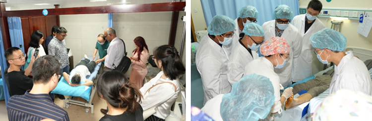 9月16日,代表團(tuán)首站訪問(wèn)湖南中醫(yī)藥大學(xué)第二附屬醫(yī)院。醫(yī)院黨委副書(shū)記游柏穩(wěn)代表院方致歡迎辭。隨后,皮膚中心創(chuàng)面修復(fù)科副主任田毅與侯玉潔醫(yī)生分別就典型病例進(jìn)行了分享,以深入淺出的方式介紹了再生醫(yī)療技術(shù)在創(chuàng)面管理中的應(yīng)用機(jī)制,使代表團(tuán)對(duì)該技術(shù)有了更深入的理解。分享結(jié)束后,代表團(tuán)前往針灸推拿康復(fù)中心,參觀并親身體驗(yàn)了針灸、閃罐等傳統(tǒng)中醫(yī)治療方法。隨后,代表團(tuán)走進(jìn)創(chuàng)面修復(fù)科病房,現(xiàn)場(chǎng)觀摩了應(yīng)用再生醫(yī)療技術(shù)為糖尿病足及放射性皮炎患者規(guī)范換藥的全過(guò)程,并就放射性皮炎在創(chuàng)面處理中的難點(diǎn)與關(guān)鍵治療環(huán)節(jié)進(jìn)行了交流。參觀環(huán)節(jié)結(jié)束后,雙方專(zhuān)家再度座談,圍繞慢性創(chuàng)面治療的最新進(jìn)展、中馬兩國(guó)醫(yī)療體系的差異等議題展開(kāi)了深入討論。
