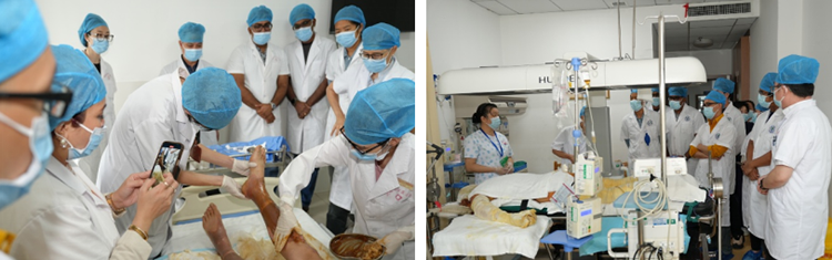 9月18日,代表團(tuán)赴瀏陽(yáng)市開(kāi)展醫(yī)療交流,先后訪問(wèn)了瀏陽(yáng)市中醫(yī)院與瀏陽(yáng)市人民醫(yī)院。兩家醫(yī)院在再生醫(yī)療技術(shù)臨床應(yīng)用方面均擁有深厚積累,尤其在大面積燒傷綜合救治領(lǐng)域成效顯著。當(dāng)日上午,代表團(tuán)首先到訪瀏陽(yáng)市中醫(yī)院,在燒傷科主任朱樹(shù)昌的陪同講解下,代表團(tuán)實(shí)地了解到了翻身床、懸浮床、紅外線照射等設(shè)備在大面積燒傷治療中的輔助應(yīng)用,并就中西醫(yī)結(jié)合模式在提升創(chuàng)面修復(fù)效果與患者滿意度方面的實(shí)踐路徑,進(jìn)行了深入交流。下午,代表團(tuán)轉(zhuǎn)赴瀏陽(yáng)市人民醫(yī)院。周明亮院長(zhǎng)結(jié)合典型病例,系統(tǒng)介紹了該院將大面積燒傷創(chuàng)面的治療經(jīng)驗(yàn)轉(zhuǎn)化應(yīng)用于慢性難愈合創(chuàng)面的臨床策略與關(guān)鍵技術(shù)。隨后,皮膚醫(yī)學(xué)中心主任蔣章佳與燒傷重建創(chuàng)面修復(fù)科主任焦獻(xiàn)功共同展示了獲專(zhuān)利認(rèn)證的醫(yī)院自研設(shè)備——磨痂器及環(huán)鉆治療術(shù),借助臨床案例生動(dòng)演示了該技術(shù)在處理大面積燒傷創(chuàng)面、慢性難愈合創(chuàng)面及瘢痕綜合管理中的顯著療效。訪問(wèn)期間,代表團(tuán)還與兩院醫(yī)護(hù)人員圍繞再生醫(yī)療技術(shù)的規(guī)范化實(shí)施、治療流程優(yōu)化及植皮手術(shù)操作要點(diǎn)等議題,開(kāi)展了廣泛而專(zhuān)業(yè)的座談交流。