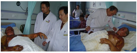 會(huì)議組長大家參觀走訪了四川災(zāi)區(qū)醫(yī)院,所到之處都能聽到、看到徐榮祥教授帶領(lǐng)抗震救災(zāi)創(chuàng)瘍專家醫(yī)療隊(duì),以一名普通醫(yī)生身份救治傷員得事跡。德陽市人民醫(yī)院燒傷科病房中已經(jīng)人滿為患,走道中都是簡易病床,一位而從浙江轉(zhuǎn)來的10歲小傷員,當(dāng)?shù)匾獮樗刂?,她母親聽說德陽市人民醫(yī)院可以用再生技術(shù)保住下肢就來到醫(yī)院求治,在李永忠主任精心治療下,應(yīng)用MEBO和“美寶創(chuàng)面速愈貼”成功救治保住了肢體。