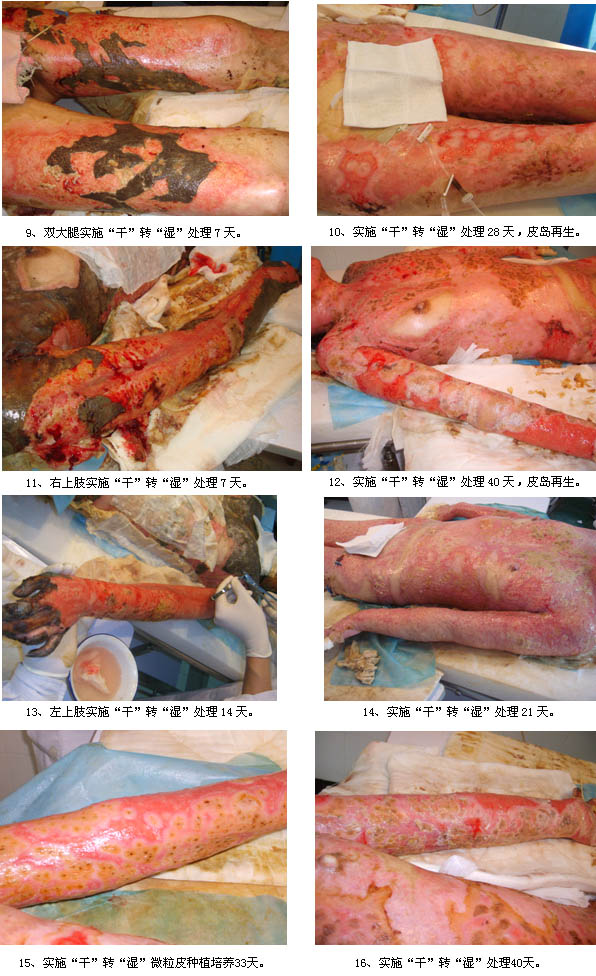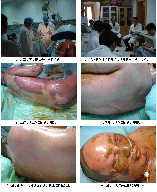 組圖四.患者陳某某,男,39歲。因液化氣爆燃燒傷全身20分鐘急診收住重慶醫(yī)科大學(xué)附屬第二醫(yī)院創(chuàng)傷燒傷科。經(jīng)查體,初步診斷為:大面積特重度燒傷(TBSA=90%,淺II度50%,深I(lǐng)I度淺型35%,深I(lǐng)I度深型5%)?;颊呷朐汉螅瑒?chuàng)傷燒傷科主任、重慶市中西醫(yī)結(jié)合學(xué)會(huì)燒傷專業(yè)委員會(huì)副主任委員簡(jiǎn)華剛教授一方面立即組織科室力量展開補(bǔ)液抗休克等全身綜合治療,同時(shí)燒傷創(chuàng)面果斷、及時(shí)地選擇了國(guó)際領(lǐng)先的燒傷皮膚再生技術(shù)進(jìn)行處理;另一方面將患者燒傷面積大、病情危重的情況向醫(yī)院領(lǐng)導(dǎo)做了詳細(xì)的匯報(bào),并向北京燒傷創(chuàng)瘍研究所(燒傷皮膚再生技術(shù)發(fā)明和技術(shù)專利單位)請(qǐng)求技術(shù)支持,以使該患者的治療得到更好的技術(shù)保障。由于治療措施及時(shí)、到位和有效,經(jīng)過18天的治療,目前患者病情穩(wěn)定,創(chuàng)面已經(jīng)愈合了98%,而且均為生理性的皮膚再生復(fù)原,患者、家屬和單位領(lǐng)導(dǎo)對(duì)治療的效果非常的滿意。該病例應(yīng)用燒傷皮膚再生新技術(shù)救治獲得成功,將對(duì)重慶醫(yī)科大學(xué)附屬二醫(yī)院的燒傷創(chuàng)傷學(xué)科發(fā)展起到積極的推動(dòng)作用,為重慶市的學(xué)術(shù)發(fā)展奠定了堅(jiān)實(shí)的基礎(chǔ),為廣大的重慶市民和燒傷患者帶來了福音。