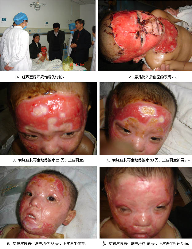 組圖三.患兒,女,3歲。因面、頸、胸部燒傷創(chuàng)面疼痛、不愈合15天,由重慶市某醫(yī)院轉(zhuǎn)院至遵義醫(yī)學(xué)附屬醫(yī)院進(jìn)一步治療?;純簜笤谥貞c市某醫(yī)院采用干燥保痂的方法處理創(chuàng)面,溶痂后醫(yī)院告知家長(zhǎng)必須實(shí)施多次手術(shù)植皮治療才能封閉創(chuàng)面,當(dāng)患者家屬由于無能力承擔(dān)巨額的手術(shù)費(fèi)用犯愁之時(shí),獲知遵義醫(yī)學(xué)附屬醫(yī)院有一種皮膚再生技術(shù)治療燒傷,便轉(zhuǎn)入遵義醫(yī)學(xué)院燒傷整形科進(jìn)行進(jìn)一步的治療。患兒入院后,燒傷科非常重視該病例的治療,燒傷科主任王達(dá)利教授與從北京趕來的燒傷皮膚再生專家一道,認(rèn)真細(xì)致地查看創(chuàng)面,組織全科人員進(jìn)行了病例討論:患兒年齡小、創(chuàng)面大,同時(shí)考慮到選擇手術(shù)植皮的創(chuàng)傷大(約16%)、麻醉風(fēng)險(xiǎn)高、治療費(fèi)用昂貴等因素,不適合采用西醫(yī)外科植皮技術(shù)治療,最終決定選擇采用目前國(guó)際領(lǐng)先的皮膚再生技術(shù)進(jìn)行治療。真是功夫不負(fù)有心人,經(jīng)過45天的皮膚再生培養(yǎng)的規(guī)范創(chuàng)面處理,患兒的創(chuàng)面奇跡般地實(shí)現(xiàn)了皮膚再生修復(fù),獲得了神奇的治療效果。值得一提的是,當(dāng)王達(dá)利教授帶著這個(gè)病例的真實(shí)治療經(jīng)過的圖片外出進(jìn)行學(xué)術(shù)交流時(shí),眾多燒傷專家無不被燒傷皮膚再生技術(shù)的真實(shí)療效所折服。