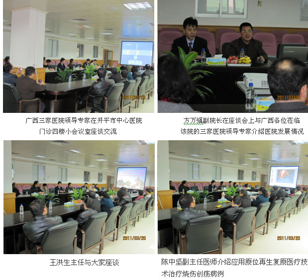 為打造優(yōu)勢(shì)專(zhuān)科,在中國(guó)中西醫(yī)結(jié)合學(xué)會(huì)燒傷專(zhuān)業(yè)委員會(huì)常委、中國(guó)燒傷創(chuàng)瘍雜志副總編輯、北京燒傷創(chuàng)瘍研究所副所長(zhǎng)、臨床研究部王洪生主任的精心安排下,廣西來(lái)賓市中醫(yī)醫(yī)院、貴港市中醫(yī)醫(yī)院、桂平市中醫(yī)醫(yī)院三家醫(yī)院的院長(zhǎng)親自?huà)鞄?,帶領(lǐng)院級(jí)領(lǐng)導(dǎo)及相關(guān)科室主任、護(hù)理部主任、護(hù)士長(zhǎng)和相關(guān)專(zhuān)業(yè)專(zhuān)家一行36人于2011年3月20日上午9時(shí),齊聚廣東省開(kāi)平市中心醫(yī)院,拉開(kāi)了兩廣多家醫(yī)院跨省區(qū)考察和臨床學(xué)術(shù)交流的序幕。