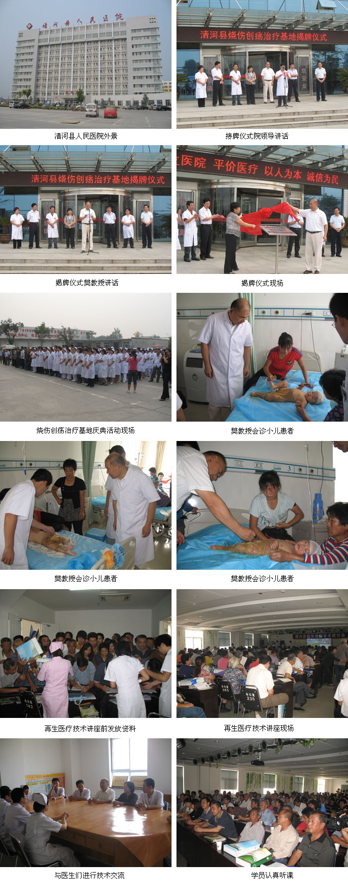 2010年9月15日,清河縣人民醫(yī)院迎來了建院62周年和燒傷創(chuàng)瘍基地醫(yī)院掛牌雙喜臨門的好日子。中國中西醫(yī)結(jié)合學(xué)會燒傷專業(yè)委員會河北區(qū)辦事處主任王琳琳及辦事處的工作人員陪同中國中西醫(yī)結(jié)合學(xué)會燒傷專業(yè)委員會委員樊兆宗教授參加了慶典活動和燒傷創(chuàng)瘍治療基地的掛牌儀式。清河燒傷創(chuàng)瘍治療基地被稱作是一項造福百姓的民生工程,從基地籌備到成立都受到了縣委縣政府、衛(wèi)生局領(lǐng)導(dǎo)的高度重視和大力支持。上午九點慶典活動正式開始,縣領(lǐng)導(dǎo)和衛(wèi)生局領(lǐng)導(dǎo)先后致賀詞,對清河縣人民醫(yī)院62年來取得的成績給予了肯定,對燒傷創(chuàng)瘍治療基地的成立表示衷心祝賀,對再生醫(yī)療技術(shù)給予了高度贊揚,同時希望醫(yī)院通過這項民生工程造福更多的患者。參加這次慶典活動的相關(guān)部門領(lǐng)導(dǎo)及醫(yī)務(wù)人員共500余人,當(dāng)?shù)仉娨暸_為此進行了全程報道。