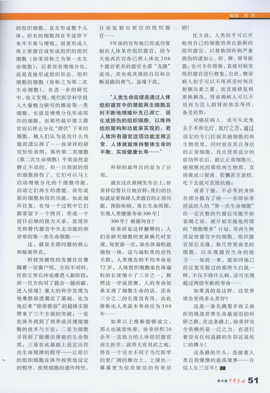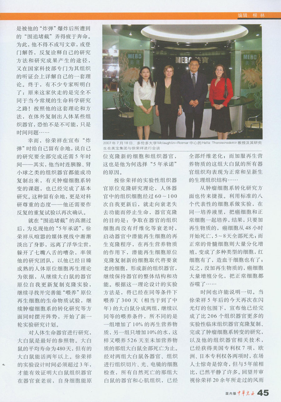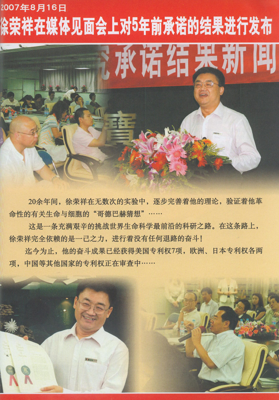 2002年8月1 6日,備受爭(zhēng)議的醫(yī)學(xué)科學(xué)工作者徐榮祥教授通過(guò)媒體宣布,他和他的研究團(tuán)隊(duì)經(jīng)數(shù)年努力.在人體原位和體外成功復(fù)制出了組織器官!同時(shí)宣布,將用5年時(shí)間“克隆”出人體所有組織器官.同時(shí)破解癌癥之謎!這一爆炸性的新聞,震驚了醫(yī)學(xué)科學(xué)界,一時(shí)間質(zhì)疑聲四起。同年的《中華兒女》第1 0期上,就以《驚世駭俗徐榮祥》為題,詳細(xì)報(bào)道了他別辟蹊徑的生命科學(xué)研究之路。