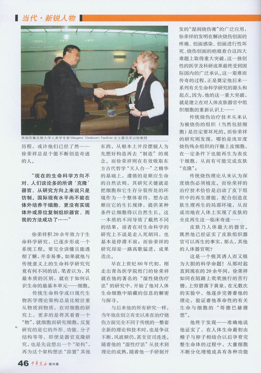 與后來(lái)他的所有研究一樣,當(dāng)年他在創(chuàng)立有史以來(lái)在治療燒傷方面完全不同于傳統(tǒng)的一整套全新的理論和技術(shù)時(shí),也是爭(zhēng)議不斷,風(fēng)波頻仍,甚至官司連連。隨著他的“濕性療法”從技術(shù)到理論的成熟,隨著他一手研制開發(fā)的“濕潤(rùn)燒傷膏”的廣泛應(yīng)用,徐榮祥的發(fā)明在解決燒傷創(chuàng)面的疼痛、創(chuàng)面感染、創(chuàng)面進(jìn)行性壞死、燒傷創(chuàng)面的疤痕愈合這四大難題上取得重大突破,這一獨(dú)創(chuàng)性的醫(yī)學(xué)及科研成果最終受到國(guó)際國(guó)內(nèi)的廣泛承認(rèn)。這一艱難而傳奇的過(guò)程,正是奠定他后來(lái)一系列有關(guān)生命科學(xué)研究的源頭和起點(diǎn)。因?yàn)?,他的這一重大突破,就是建立在對(duì)人體皮膚器官中組織細(xì)胞的重新認(rèn)識(shí)上——