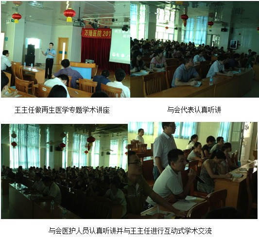 會議于當(dāng)日下午2時(shí)40分準(zhǔn)時(shí)在該院會議室舉行,來自四會市人民醫(yī)院、中醫(yī)院、婦幼醫(yī)院、紅會醫(yī)院、萬隆醫(yī)院及大沙、黃田、羅源等鎮(zhèn)衛(wèi)生院共16個(gè)醫(yī)療單位共200余人參會到會聆聽王主任的專題講座,萬隆醫(yī)院業(yè)務(wù)副院長汪國斌主持了會議,市衛(wèi)生局徐美華科長到會發(fā)表賀詞。在學(xué)術(shù)講座中,王主任首先向與會代表就近年來在再生醫(yī)學(xué)領(lǐng)域所取得的重大實(shí)驗(yàn)及臨床研究成果,并結(jié)合了大量的臨床病例圖片及錄像資料,主要針對各類難愈性創(chuàng)傷、潰瘍創(chuàng)面的規(guī)范化處理方法與技巧、注意事項(xiàng)等進(jìn)行了細(xì)致地講解,活動持續(xù)到下午17時(shí)40分結(jié)束。