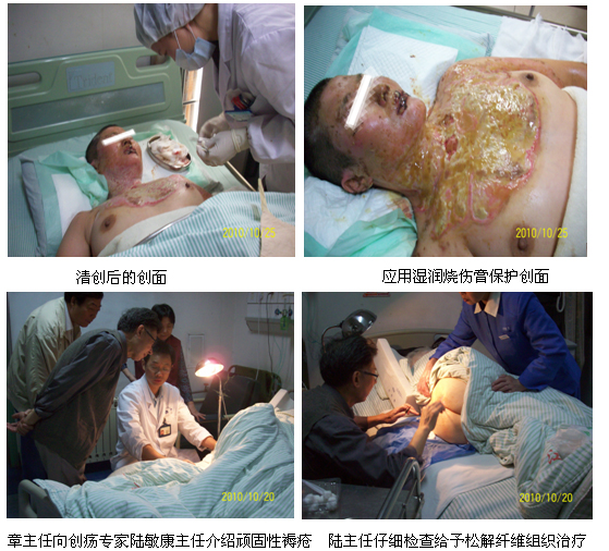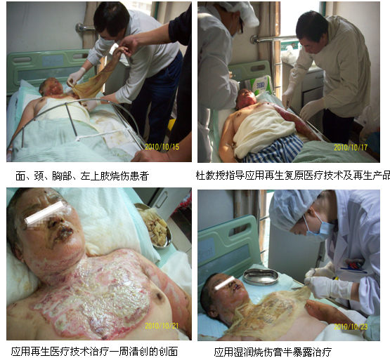 2010年10月9日,在南京舉辦了各大醫(yī)院燒傷整形科高級醫(yī)療人員座談會(huì)后,江蘇省人民醫(yī)院燒傷整形科率先在臨床推廣應(yīng)用再生醫(yī)療技術(shù)及再生系列產(chǎn)品治療燒傷患者3名,應(yīng)用創(chuàng)瘍貼治療褥瘡患者1名。在應(yīng)用再生醫(yī)療技術(shù)治療兩周后,其中1名燒傷患者以痊愈出院,另1名患者大部分燒傷創(chuàng)面已愈合,部分深I(lǐng)I度~淺III度創(chuàng)面組織生機(jī)良好。患者應(yīng)用再生醫(yī)療技術(shù)換藥治療時(shí),創(chuàng)面“不疼痛、不出血、創(chuàng)面不存留液化物和壞死組織”(即創(chuàng)面治療三不原則),深受醫(yī)生護(hù)士和患者及家屬的歡迎,達(dá)到了推廣再生復(fù)原醫(yī)療技術(shù)地目的。