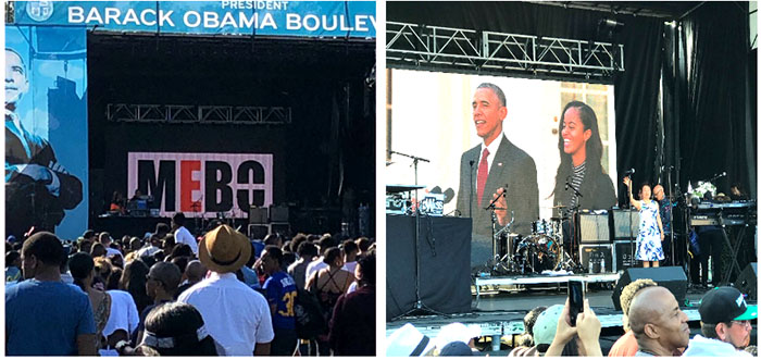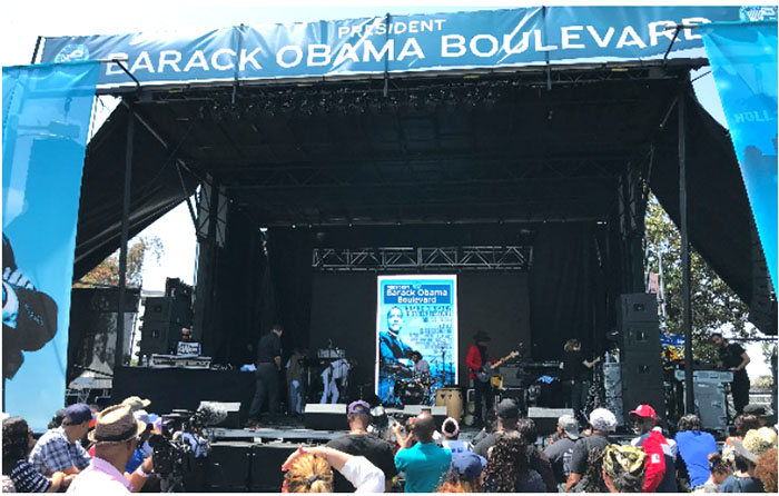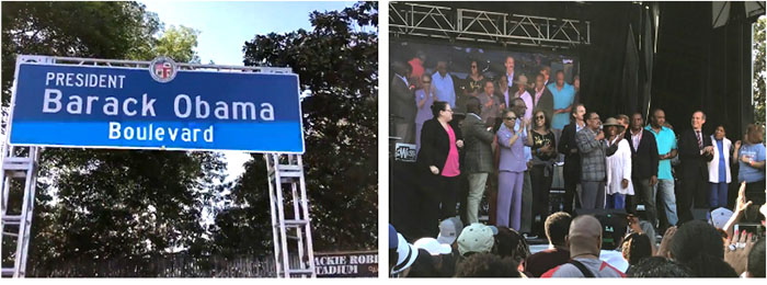 洛杉磯市于5月4日正式將羅德奧路(Rodeo Road)改名為奧巴馬大道(Obama Boulevard),以紀念美國第一位非洲裔總統(tǒng)。數(shù)千名興奮的群眾從中午開始陸續(xù)匯集在改名后的奧巴馬大道和與其交匯的馬丁路德金大道上,以音樂會和游園會的形式歡慶奧巴馬大道在洛杉磯市正式出現(xiàn)。