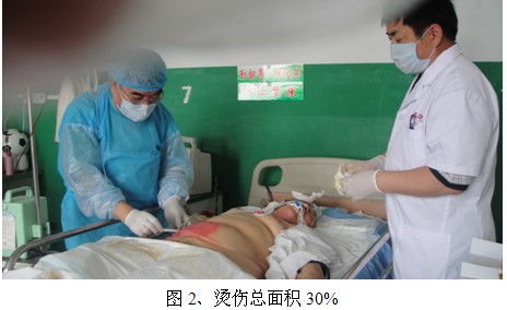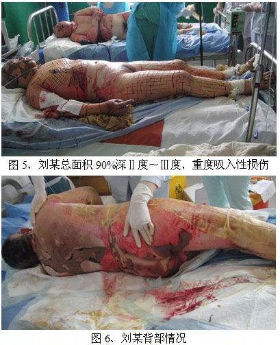 北京燒傷創(chuàng)瘍研究所醫(yī)療部主任王廣順教授于2011年4月30日下午19:15分,應(yīng)該院楊院長(zhǎng)、張西軍主任、馬思泉主任的邀請(qǐng),在山東省辦事處劉玉芳同志陪同下來到該院重癥監(jiān)護(hù)室查看了3名燒傷患者,他們都是傷后時(shí)間約20個(gè)小時(shí)左右,分別是太陽(yáng)能熱水器故障燙傷總面積30%、腦外傷、頭皮裂傷;鍋爐爆炸燒傷張某燒傷總面積達(dá)85%TBSA,為深Ⅱ度~Ⅲ度燒傷,重度吸入性損傷;劉某燒傷總面積90%TBSA,為深Ⅱ度~Ⅲ度燒傷,重度吸入性損傷。前者處在嗜睡狀態(tài),后二者血小板僅54×109/L,張某尿色深混濁,7個(gè)小時(shí)內(nèi)尿量?jī)H300ml,躁動(dòng)不安,創(chuàng)面腫脹、硬無彈性。王教授立即對(duì)Ⅲ度創(chuàng)面進(jìn)行“切劃減張療法”,并涂美寶濕潤(rùn)燒傷膏及用美寶創(chuàng)瘍貼止血治療。平衡鹽液糾正水電介質(zhì)酸堿紊亂、20%甘露醇125ml-速尿20mg-利多卡因50mg-654-25mg組成的利尿合劑、血必凈、生脈注射液、補(bǔ)充血小板等全身治療方案,目前患者血小板已回升、尿量增加,病情逐漸穩(wěn)定。
