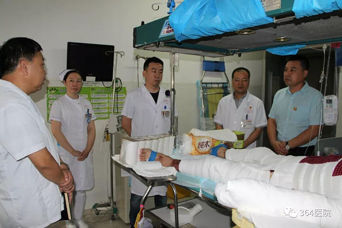 9月5日上午,中國(guó)紅十字基金會(huì)徐榮祥再生生命公益基金志愿者黃彥勇一行,在364醫(yī)院黨委書(shū)記、院長(zhǎng)李廣衡和副院長(zhǎng)張鋒、劉永良的陪同下,來(lái)到航空工業(yè)襄陽(yáng)醫(yī)院(364醫(yī)院)燒傷科重病監(jiān)護(hù)室,看望慰問(wèn)特重度燒傷患者任海鵬及其家屬龍榮榮。