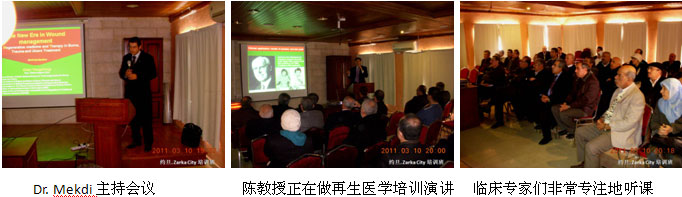1、3月8日晚上8時,市級培訓(xùn)班在Amman市Le Meridien Hotel成功舉辦。來自全市30多家醫(yī)院、診所和藥房的70多名臨床醫(yī)師、護士和藥師參加了再生醫(yī)學(xué)技術(shù)培訓(xùn)會,來自中國燒傷創(chuàng)瘍科技中心的陳永翀教授應(yīng)邀做了再生醫(yī)學(xué)技術(shù)的演講培訓(xùn),培訓(xùn)現(xiàn)場學(xué)習(xí)氛圍濃厚,大家的學(xué)習(xí)熱情也很高漲,培訓(xùn)和討論一直持續(xù)到晚上10點多鐘才結(jié)束。
