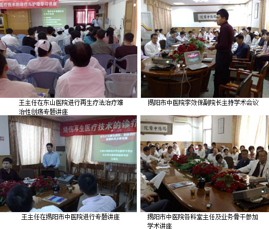 2009年2月27日來自中國中西醫(yī)結(jié)合學(xué)會燒傷專業(yè)委員會常委、北京燒傷創(chuàng)瘍研究所副所長、燒傷治療專家王洪生教授來到揭陽市中醫(yī)院講授皮膚器官原位再生復(fù)原技術(shù)。揭陽市中醫(yī)院剛剛上任一周的謝院長非常重視,業(yè)務(wù)副院長李孝保親自作陪并主持本次的學(xué)習(xí)活動,醫(yī)務(wù)科組織了院內(nèi)的相關(guān)科室醫(yī)務(wù)人員30多人參加了本次題為“創(chuàng)瘍創(chuàng)面的再生治療”的學(xué)習(xí)。王洪生教授系統(tǒng)地把有關(guān)創(chuàng)面治療的發(fā)展以及當(dāng)前最先進(jìn)的治療方法—皮膚器官原位再生復(fù)原技術(shù)及其配套產(chǎn)品速愈貼在此領(lǐng)域取得的良好效果,用大量的圖片實(shí)例向醫(yī)護(hù)人員作了詳盡的講解。醫(yī)生們專心致志地作著筆記,學(xué)習(xí)結(jié)束后紛紛表示一定要把最好的治療效果好好應(yīng)用,造福百姓。趁著王主任的到來,該院骨外科的醫(yī)生和護(hù)士還馬上邀請王教授到病房作現(xiàn)場指導(dǎo)。