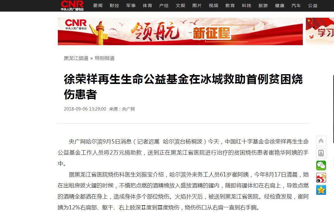 央廣網(wǎng)哈爾濱9月5日消息(記者遲嵩  哈爾濱臺楊桐波)今天,中國紅十字基金會徐榮祥再生生命公益基金工作人員將2萬元捐助款,送到正在黑龍江省醫(yī)院進行治療的貧困燒傷患者崔艷華阿姨的手中。
