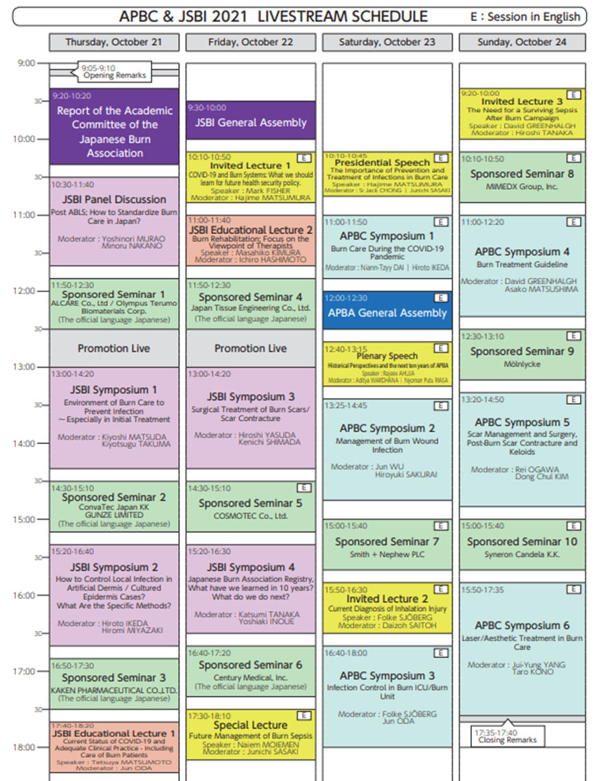 2021年10月21日至10月24日,第13屆亞太燒傷會議(APBC 2021)暨日本燒傷學(xué)會(JSBI)第47屆年會以虛擬會議的形式舉行。亞太燒傷會議是國際燒傷會議日歷上的一項重要活動,它匯聚了來自各國的醫(yī)生、護士及科研人員等,為全球醫(yī)務(wù)工作者分享臨床治療經(jīng)驗、最新研究成果和臨床管理方法提供了一個寶貴的平臺。本屆大會的主題為“燒傷治療的下一次動態(tài)變化——應(yīng)對感染、預(yù)防和控制感染”(The Next Dynamic Change in Burn Care – Coping with Infection, Infection Prevention and Control)。