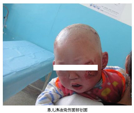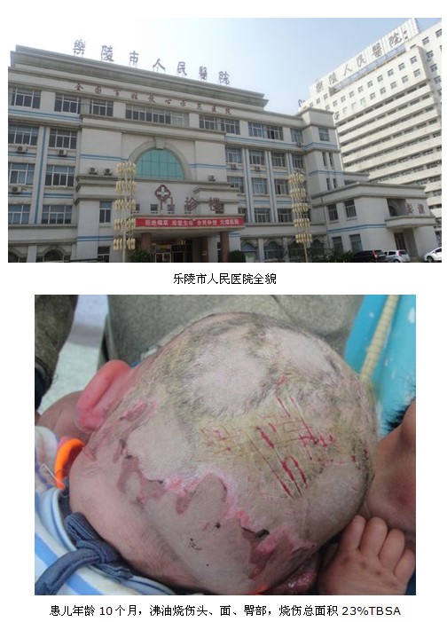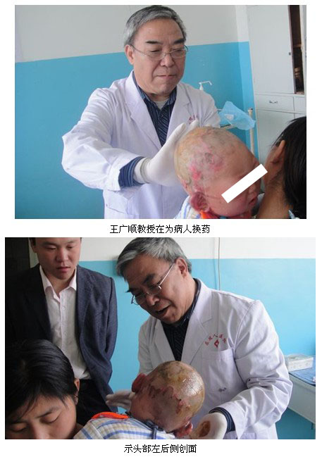 樂(lè)陵市人民醫(yī)院燒傷科于2011年4月25日接收了1名頭皮沸油燒傷小兒患者,該院高院長(zhǎng)、燒傷科吳主任非常重視,與燒傷科魯國(guó)軍醫(yī)生一同為患兒采用再生醫(yī)療技術(shù)治療,治療1天后,該患兒兩眼瞼腫脹,頭皮創(chuàng)面蒼白,痂皮硬,小兒哭鬧。北京市燒傷創(chuàng)瘍研究所醫(yī)療部專家王廣順教授當(dāng)時(shí)正在濟(jì)南106醫(yī)院為蒙古國(guó)右足凍傷小伙治療,在接到該院領(lǐng)導(dǎo)的邀請(qǐng)后立即與徐亞磊同志一起乘車趕到該院進(jìn)行技術(shù)指導(dǎo)。下午6點(diǎn),王廣順教授在該院燒傷科吳主任、魯大夫及護(hù)士長(zhǎng)的陪同下來(lái)到病房,見患兒年齡僅10個(gè)月,沸油燒傷頭面、臀部,燒傷總面積23%TBSA。王廣順教授親自應(yīng)用再生復(fù)原醫(yī)療技術(shù)為患者換藥,頭皮Ⅲ度創(chuàng)面采用“耕耘療法”,通過(guò)涂藥等局部治療后,又進(jìn)一步調(diào)整了全身治療方案。次日換藥治療時(shí)察看該患兒頭皮Ⅲ度創(chuàng)面,已見耕耘處紅暈、新鮮有彈性。