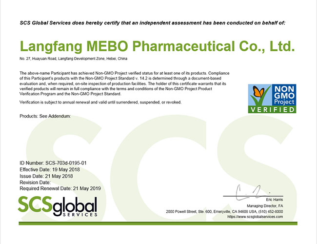 2018年5月21日,經(jīng)國際知名第三方認(rèn)證公司SCS Global Services承辦,美寶廊坊基地通過非轉(zhuǎn)基因項目認(rèn)證。