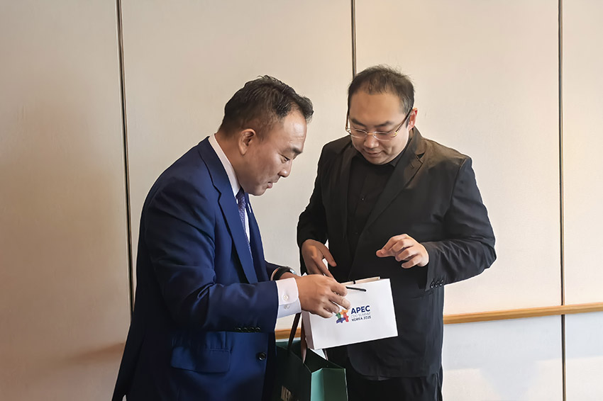 會后,雙方互贈具有深厚APEC淵源的紀(jì)念禮品。 李成宇副會長向徐鵬主席贈送了韓國2025年APEC領(lǐng)導(dǎo)人峰會官方紀(jì)念幣套裝。徐鵬主席則回贈了美寶燒傷膏(韓國在售版本)以及MIAGE高端護(hù)膚品套裝。這兩份回贈禮品均承載著往屆APEC的印記:MIAGE產(chǎn)品是2023年美國舊金山APEC領(lǐng)導(dǎo)人峰會官方禮品袋的重要成員;而美寶燒傷膏則是2024年秘魯利馬APEC領(lǐng)導(dǎo)人峰會的官方禮品之一。此次互贈,不僅體現(xiàn)了雙方的情誼,更巧妙地串聯(lián)起歷屆APEC峰會的深厚淵源。
