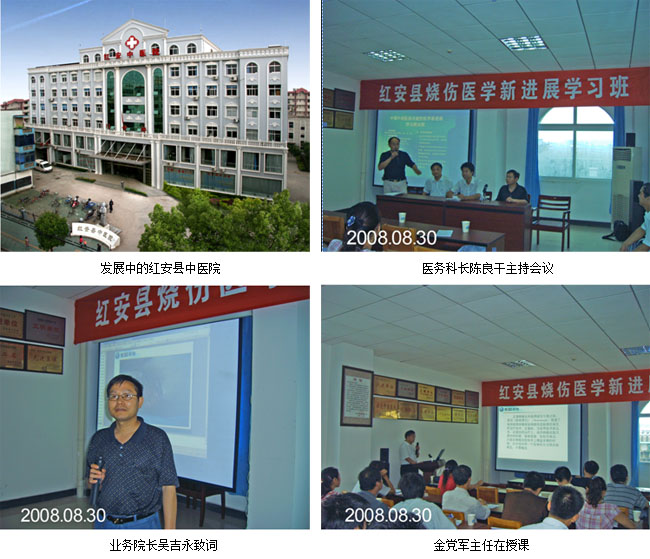 2008年8月30日 有中國中西醫(yī)結(jié)合學(xué)會(huì)燒傷專業(yè)委員會(huì)主辦,紅安縣衛(wèi)生局、紅安縣中醫(yī)院承辦“再生醫(yī)療技術(shù)新進(jìn)展學(xué)習(xí)班”在中醫(yī)院學(xué)術(shù)廳拉開帷幕。紅安縣地處鄂、豫、皖三省交界。是革命老區(qū),著名的將軍縣,這次學(xué)術(shù)活動(dòng)得到縣衛(wèi)生局李汝才局長、醫(yī)政股長袁波、中醫(yī)院院長李長樂、等領(lǐng)導(dǎo)的大力支持。并對(duì)燒傷皮膚原位再生醫(yī)療技術(shù)在多學(xué)科的應(yīng)用前景,和專家無償?shù)貙?duì)基層醫(yī)生進(jìn)行技術(shù)指導(dǎo)培訓(xùn),給與高度地評(píng)價(jià)。29—30日雖然連續(xù)兩天持續(xù)強(qiáng)降暴雨但仍有40幾個(gè)單位,120多名基層醫(yī)生冒雨前來學(xué)習(xí)。會(huì)議有醫(yī)務(wù)科長陳良干主持、業(yè)務(wù)院長吳吉永致詞。