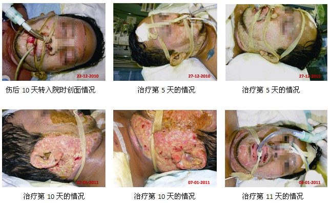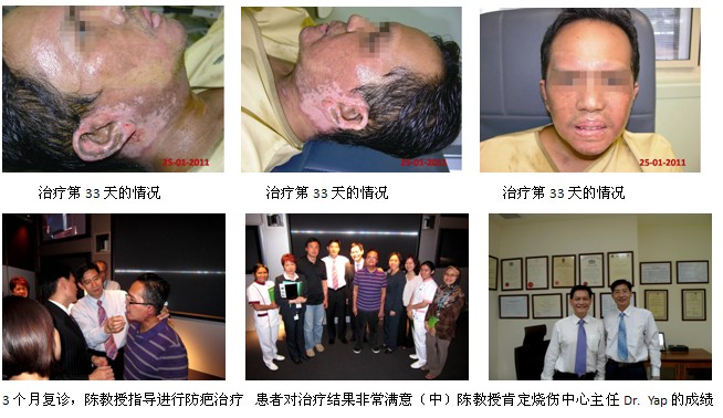 2010年11月,醫(yī)院收治了一例從外院轉(zhuǎn)來的汽油深度燒傷合并并嚴(yán)重吸入性損傷的患者(TBSA=22%,深I(lǐng)I度—淺III度),該患者是一名29歲的工程師,是在工作中被燒傷的,且燒傷部位主要集中在頭面部和雙上肢等重要功能部位和影響容貌的部位。為了使患者得到更好的恢復(fù)容貌和肢體的功能,醫(yī)院決定采用再生醫(yī)學(xué)技術(shù)治療治療這例大面積嚴(yán)重?zé)齻颊撸瑫r(shí),為了更有把握地救治好該患者,燒傷整形中心的主任Dr. Yap Lok Huei馬上與中國燒傷創(chuàng)瘍科技中心的陳永翀主任取得了聯(lián)系,陳教授通過電話和電子郵件對該患者進(jìn)行了治療指導(dǎo),醫(yī)院燒傷中心的醫(yī)護(hù)人員全程采用燒傷再生醫(yī)學(xué)技術(shù)對患者進(jìn)行規(guī)范的治療。經(jīng)過33天的規(guī)范治療,患者的所有深度燒傷創(chuàng)面不需要植皮全部實(shí)現(xiàn)燒傷皮膚原位再生愈合的臨床效果。以下是頭、面、頸部深度燒傷早期的再生愈合情況和愈合后3個(gè)月隨訪的情況: