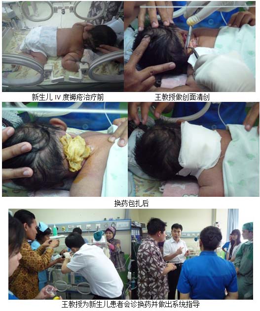 在醫(yī)療開發(fā)過(guò)程中,醫(yī)療團(tuán)隊(duì)還進(jìn)行了兩次會(huì)診:大面積燒傷及新生兒IV度褥瘡,其中新生兒的會(huì)診具有特別重要的意義。由于當(dāng)?shù)蒯t(yī)生對(duì)于褥瘡的治療經(jīng)驗(yàn)不足,沒(méi)有及時(shí)正確處理創(chuàng)面,導(dǎo)致新生兒褥瘡由淺度小面積創(chuàng)面加重為大面積IV度創(chuàng)面,病情危險(xiǎn),成為全科最棘手的病例。王教授針對(duì)這類典型的病例做了專業(yè)的診斷,發(fā)現(xiàn)了創(chuàng)面惡化的根源,并親自為患者處理創(chuàng)面、示范換藥,而后制定了后期治療方案并強(qiáng)調(diào)了重點(diǎn)注意事項(xiàng)及關(guān)鍵環(huán)節(jié),解決了醫(yī)務(wù)人員的難題,他們不禁感嘆,多虧了再生醫(yī)學(xué),才得以挽救這條幼小的生命。