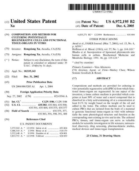 | 6972195 B2 | 在體外培養(yǎng)潛能再生細(xì)胞和有功能的組織器官的成分和方法 | 查看 |
